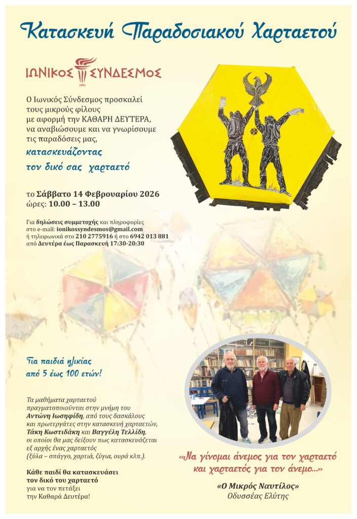 Ο Ιωνικός Σύνδεσμος, με αφορμή την Καθαρή Δευτέρα, προσκάλεσε μικρούς και μεγάλους φίλους να αναβιώσουν και να γνωρίσουν την παράδοση της κατασκευής παραδοσιακού χαρταετού, το Σάββατο 14 Φεβρουαρίου 2026, στην αίθουσα του 1ου ορόφου, όπου πραγματοποιήθηκε το καθιερωμένο εργαστήρι.