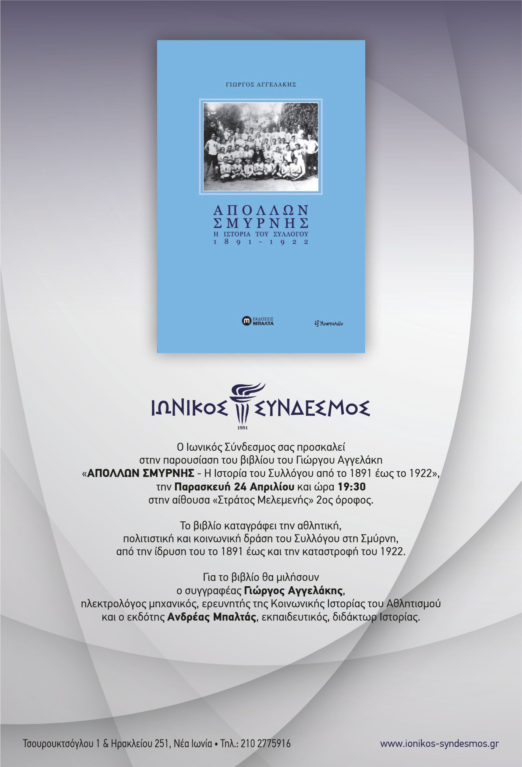 Παρουσίαση βιβλίου του Γιώργου Αγγελάκη με τίτλο «ΑΠΟΛΛΩΝ ΣΜΥΡΝΗΣ – Η Ιστορία του Συλλόγου από το 1891 έως το 1922»
