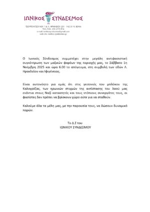 Ο Ιωνικός Σύνδεσμος συμμετέχει στην μεγάλη αντιφασιστική συγκέντρωση των μαζικών φορέων της περιοχής μας, το Σάββατο 1η Νοέμβρη 2025 και ώρα 6.00 το απόγευμα, στη συμβολή των οδών Λ. Ηρακλείου και Ιφιγένειας.